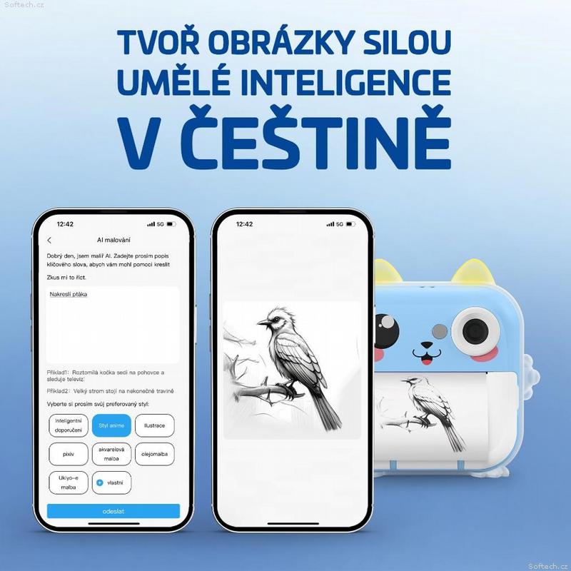 Foťák je propojený s chytrou aplikací v češtině, takže jeho ovládání zvládnou i menší děti. Aplikace toho ale umí mnohem více. Kromě tisku fotek, poznámek nebo samolepek přímo z telefonu zvládá i skenování ručně psaných zápisků, překlady textů z obrázků, AI vybarvování, tvorbu obrázků pomocí umělé inteligence nebo převod fotografií do animovaného stylu. Stačí pár kliknutí a děti si samy vytvoří obrázky přesně podle své představivosti.