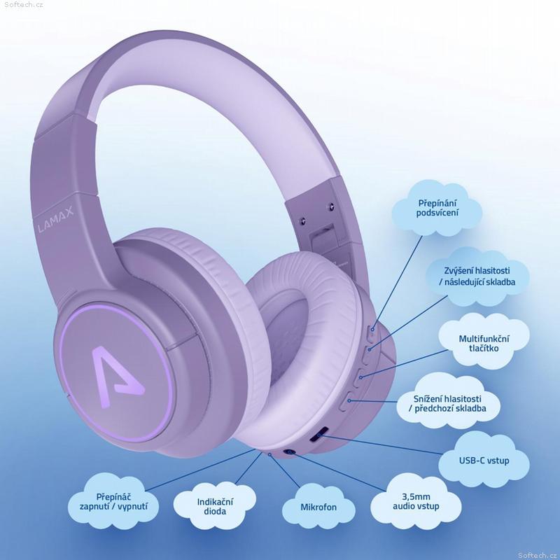 Stylový doplněk, parťák na cesty a zábava, která svítí i hraje. To jsou dětská sluchátka LAMAX GlowKid1. Byla navržena tak, aby vyhovovala jak mladším školákům, tak i starším dětem, které ocení stylový design, pohodlné nošení i funkce, které drží krok s jejich tempem. Sluchátka vydrží hrát až 20 hodinna jedno nabití, zvládnou bezdrátové připojení přes Bluetooth i klasický jack kabel a díky vestavěnému mikrofonu se hodí nejen na poslech, ale i na online výuku nebo volání s kamarády. Ochrana dětského sluchu je samozřejmostí. Hlasitost je bezpečně omezená a měkké náušníky netlačí ani při delším nošení. Skládací konstrukce usnadní přenášení a dvě barevné varianty zajistí, že si každý vybere tu svou. A to nejlepší? Sluchátka při poslechu barevně svítí, takže se z běžného poslechu stává malá světelná show. Ať už si děti zrovna hrají, tvoří, cestují nebo odpočívají u pohádky, LAMAX GlowKid1 je společník pro chvíle, které patří jen jim.