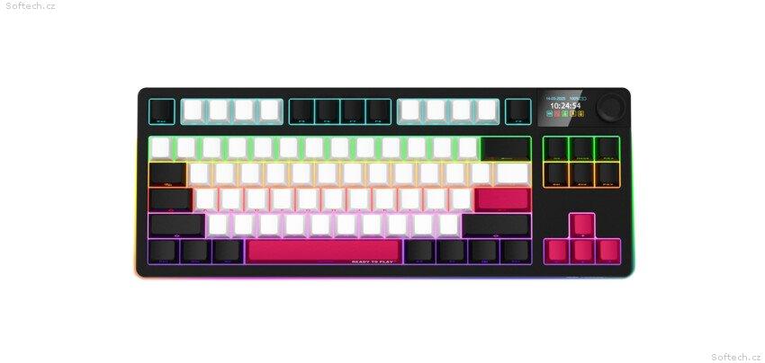 Klávesy PBT s bočním potiskem zajišťují jasnou viditelnost sekundárních funkcí, zatímco minimalistický design zachovává čistý a elegantní vzhled klávesnice. Šest kláves v kontrastních barvách (šipky, Enter a mezerník) dodává klávesnici styl, který nejen vypadá dobře, ale také pomáhá rychlé orientaci při hraní.