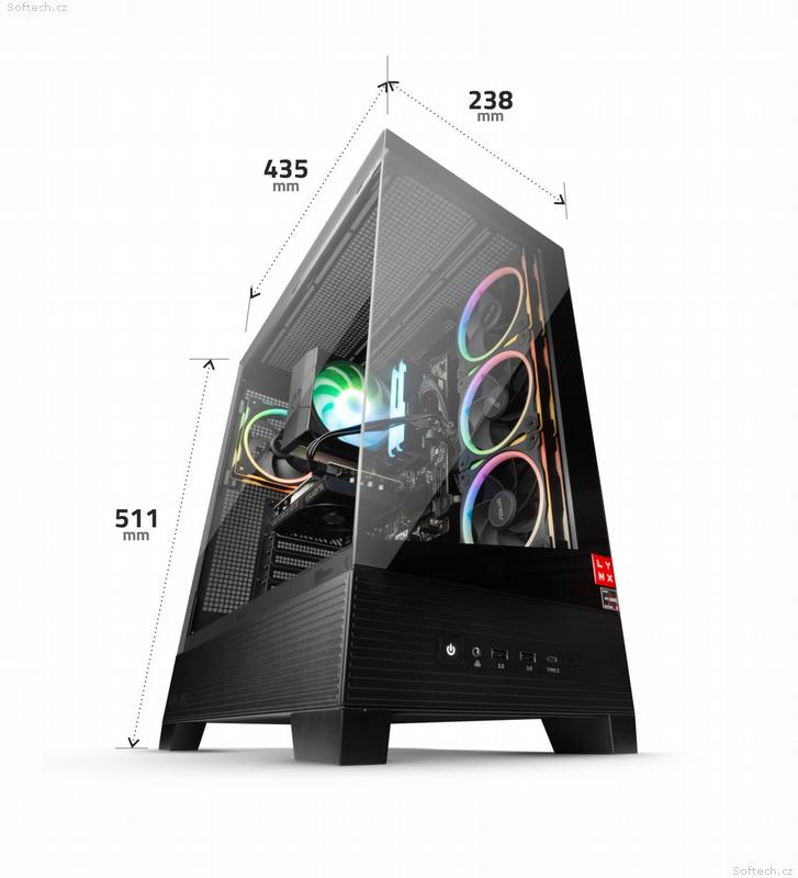 Stylová skříň s prosklenou bočnicí a čtyřmi ARGB ventilátory .