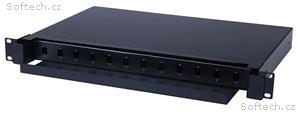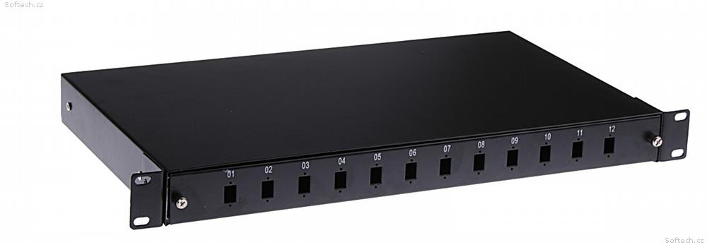 Optická výsuvná vana výšky 1U do 19" racku v černé barvě pro 12 SC simplex nebo 12 LC duplex konektorů. Dodávána je bez kabelových průchodek. Součástí vany je také kazeta na ochranu svárů.