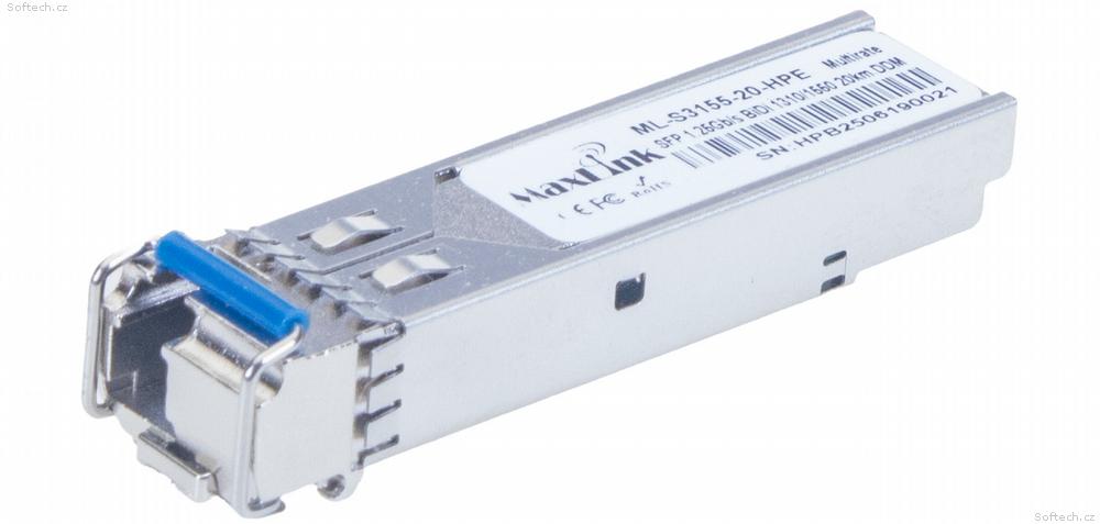 Maxlink ML-S3155-20-HPE je 1.25G SFP WDM modul s vlnovou délkou Tx 1310 / Rx 1550, jedním LC konektorem a maximální vzdáleností 20km po singlemode optickém vlákně. SFP modul podporuje monitoring (DDM).