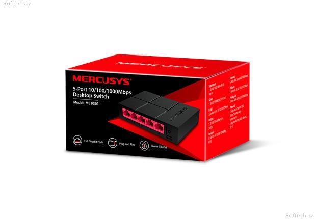 Mercusys MS105G: 5-ti portový mini stolní switch, 5x 10/100/1000 Mbps RJ45 port, plastový obal.