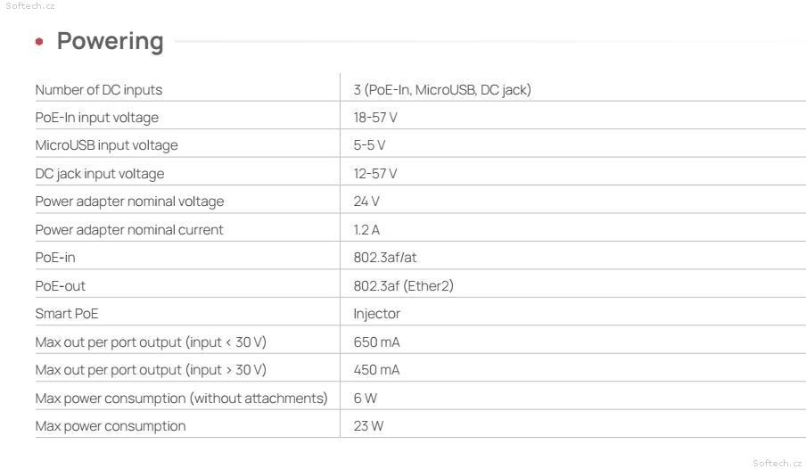 Zvolte mezi napájením přes PoE, DC konektor nebo MicroUSB - pomocí druhého ethernetového portu a funkce PoE-out můžete navíc napájet další zařízení (max. 650 mA pro napětí <30 V, max. 450 mA pro napětí >30 V).