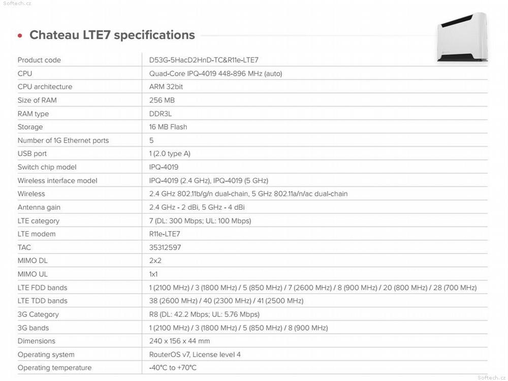 MikroTik Chateau LTE7 je elegantní dual-band Wi-Fi 5 router, pracuje současně na dvou pásmech (2,4GHz a 5GHz>) pro dosažení maximální přenosové rychlosti až 1,17Gbps (2,4GHz - 300Mbps, 5GHz - 880Mbps) a je vybaven (5) 1Gbit LAN porty.