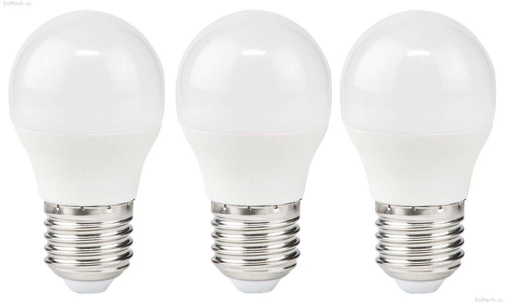 Sada tří LED žárovek o výkonu 4,9 W pro patici E27 ušetří energie a plně nahradí klasickou žárovku s výkonem 42 W. Matný kryt zajistí rovnoměrnou distribuci světla.