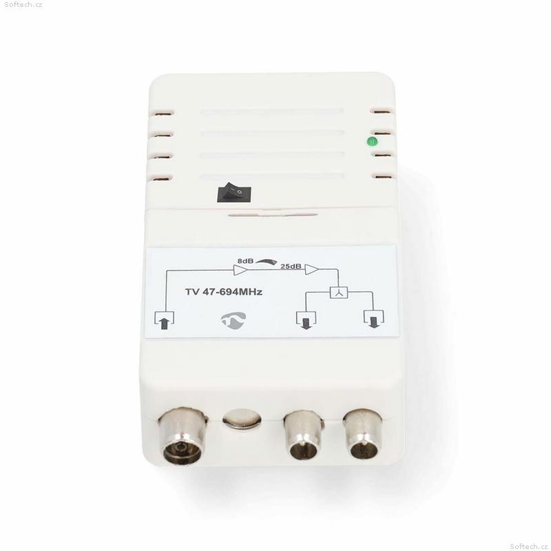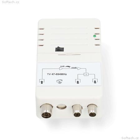 Zesilovač je vybaven LTE-700 filtrem, který účinně potlačuje rušení od 5G sítí a zajišťuje stabilní příjem televizního signálu. Kompaktní bílé provedení z materiálu ABS a zinková slitina zaručuje spolehlivý provoz s integrovaným 230 V napájecím adaptérem.