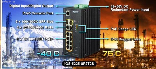Díky svému kovovému pouzdru s krytím dle certifikace IP30 odolává vysokým teplotám od -40°C do 75°C a i díky tomu je vhodný do těžkých provozů. Přepínací kapacita switche je 24 Gbps neblokovaně a propustnost činí 17,85 Mpps. Pro každý z osmi RJ-45 portů je k dispozici 36 W PoE výkonu, takže je možno napájet i energeticky náročnější zařízení.
