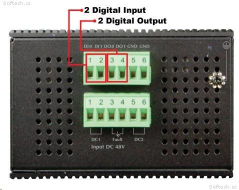 Porty: 8 x RJ-45 10/100/1000BASE-T, 2 x SFP 1000BASE-SX/LX/BX, 1 x RJ-45 sériový port konzole, 2 x DI/DO digitální logické rozhraní
