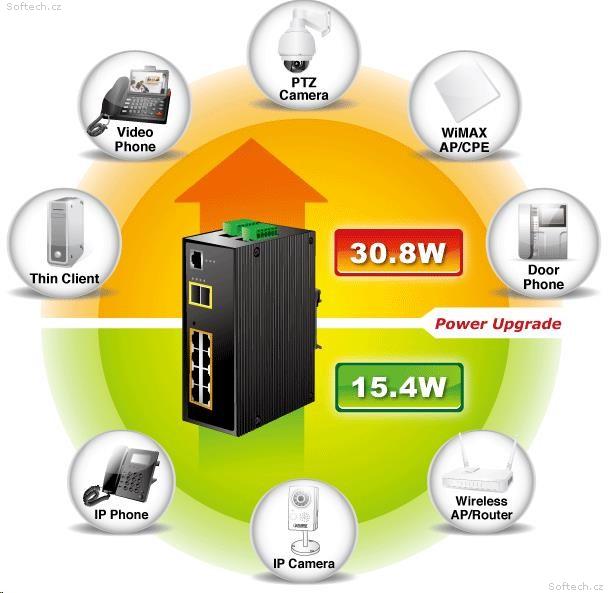 Celkový napájecí výkon: 60 W pro DC 12 V, 120 W pro DC 24 V, 240 W pro DC 48 V, IEEE 802.3af, IEEE 802.3at