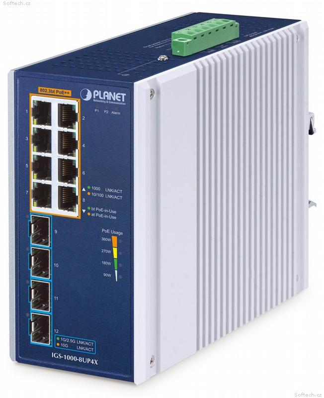Nespravovaný průmyslový L2 PoE++ switch s 8× RJ-45 10/100/1000 Base-T a 4× 10G Base-X SFP+. Porty 1–8 podporují PoE++ napájení (802.3af/at/bt), s celkovým výkon až 360 W.