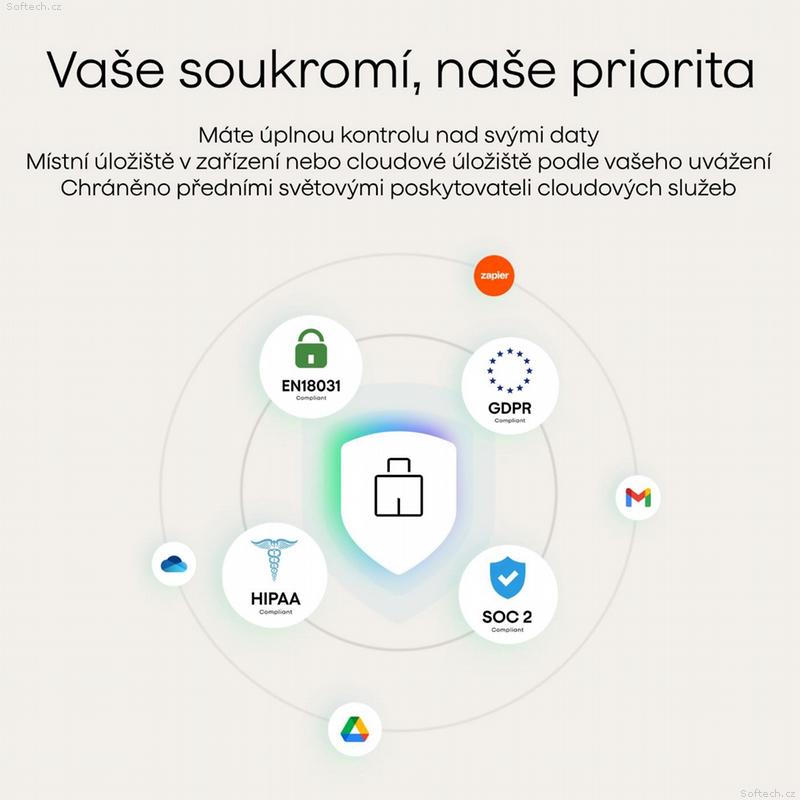 Plaud klade maximální důraz na bezpečnost vašich dat. Používá hosting pouze na serverech Amazon AWS. Navíc jsou rekordéry certifikovány pro soulad s auditním standardem SOC2, zdravotnickým standardem pro nakládání s citlivými daty pacientů HIPAA, celoevropským nařízením o ochraně osobních údajů GDPR a normou EN18031, pro kyberbezpečnost.