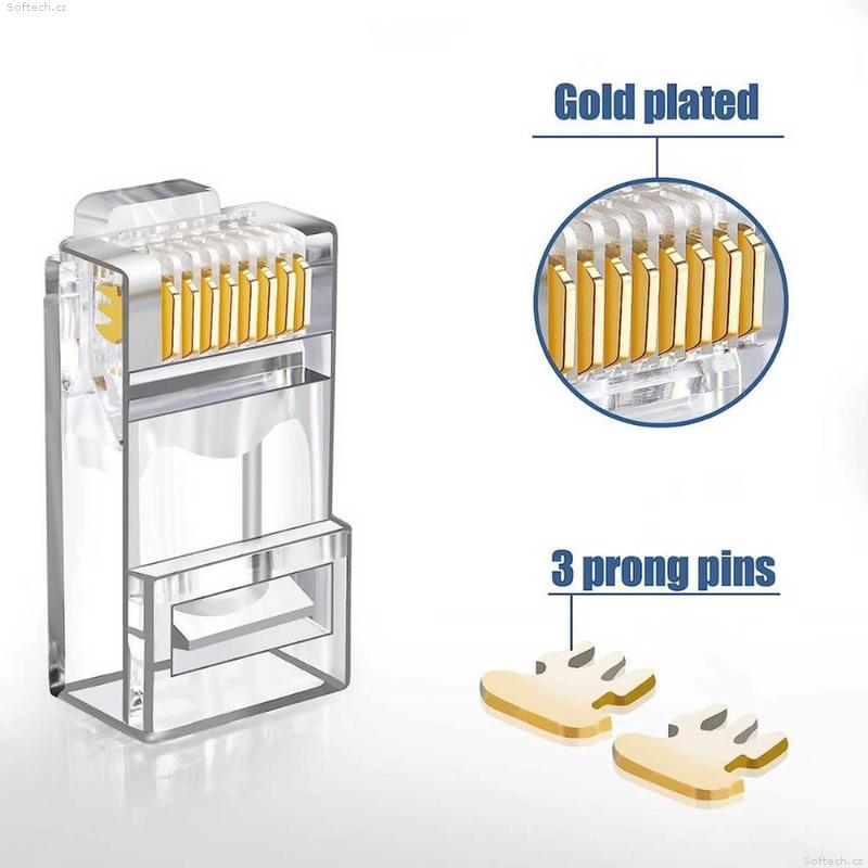 PremiumCord modulární RJ45 konektor (8P8C) pro kabely kategorie Cat6 je navržen pro čisté a spolehlivé zakončení síťových kabelů. Tento průchozí konektor usnadňuje krimpování: vodiče procházejí skrz konektor, takže lze snadno ověřit jejich pořadí a zajistit správný kontakt. Transparentní tělo umožňuje vizuální kontrolu zapojení vodičů, což minimalizuje chyby při instalaci.