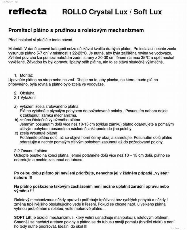 Roletové plátno ROLLO CrystalLine 240x175cm, viditelná plocha 236x133cm, 16:9, 107"/271cm, bílý hranatý kovový tubus 7x255cm/10kg, uchycení na stěnu nebo strop, materiál BetaLux - bílá 0,35 tkanina 300g/m2 s 2cm černým okrajem a zadní stranou, Gain=1,0, pozorovací úhel 120°. Lux - bílý matný povrch pro maximálně věrný a kontrastní obraz při alespoň částečném zatemnění. PVC materiál s textilním základem vytváří rovnou plochu bez zvlnění ale v krajích může docházet k prohnutí - postupně mizí. Snadné uchycení 4 vruty na plastových bocích plátna - stěna nebo strop. Možnost aretace polohy plátna při každé otáčce mechanizmu. Pozor při zpětném navíjení plátna je nutné plátno přidržovat - nesmí dojít k rychlému navinutí, které při nárazu na tubus může poškodit vnitřní mechanizmus bez možnosti uplatnění záruční doby.