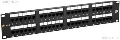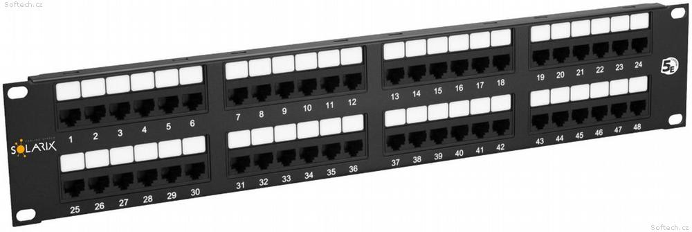 Nestíněné patch panely produktové řady Solarix – kategorie 5E jsou dodávány v provedení 12, 24 a 48 portů RJ45 a jsou osazeny moduly s duální IDC svorkovnicí typu 110/Krone. Každý kontakt je na této svorkovnici z důvodu snadného zakončení kabelu označen barvami podle typu zapojení, a to buď podle standardu T568A, nebo T568B. Tyto komponenty strukturované kabeláže Solarix jsou vyrobeny tak, aby zaručovaly dlouhou životnost, vynikající funkčnost a především spolehlivost. Nestíněné patch panely Solarix – kategorie 5E jsou testovány až do šířky pásma 150 MHz a převyšují tak požadavky na komponenty kategorie 5E definované v mezinárodních normách ANSI/TIA/EIA 568, ISO/IEC 11801 a EN 50173. Standardní barva patch panelů je černá. Velikost v datovém rozvaděči je 2U.