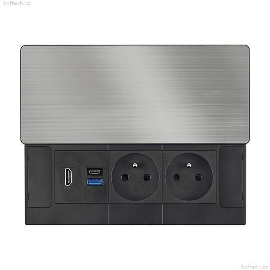 Tento vestavný blok zásuvek nabízí více než jen napájení – kombinuje dvě síťové zásuvky 230 V, USB rychlonabíječku a HDMI port v jednom kompaktním modulu. Vrchní kryt z matné tmavé nerez oceli (inox) s posuvným mechanismem se snadno začlení do moderního interiéru pracovních stolů, prezentačních prostor i obývacích pokojů. Díky kabelu o délce 2 metry je instalace flexibilní a pohodlná.