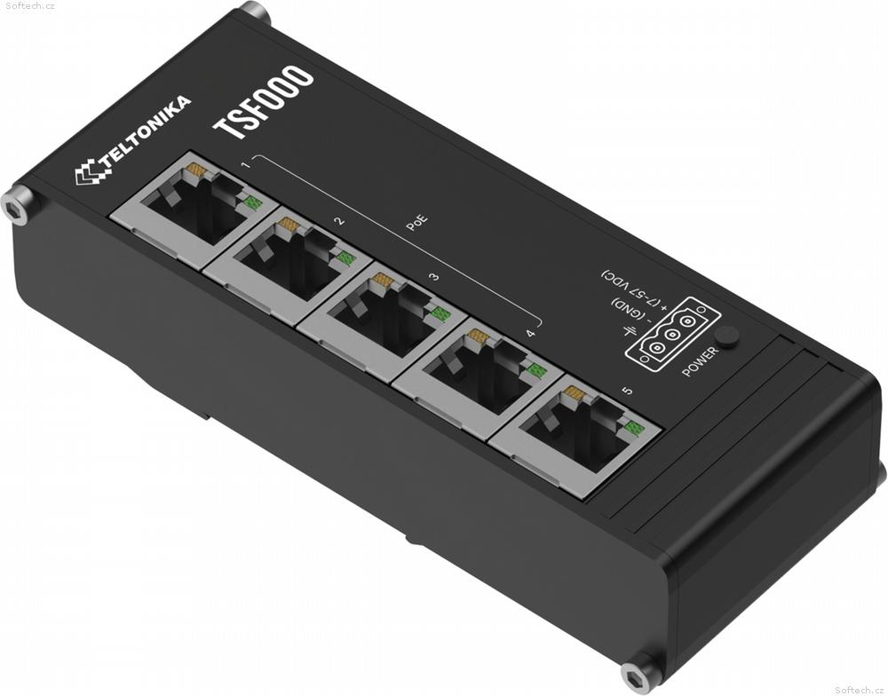 Pro funkci PoE je vyžadováno vstupní napětí 44–57 V DC. Vlastní spotřeba switche je minimální – v nečinnosti pouze 1 W, maximálně 1,5 W bez zátěže PoE. Ochrana zahrnuje přepěťovou ochranu do 60 V, ochranu proti reverzní polaritě do 80 V a přepěťové špičky s napětím průrazu 64,4–71,2 V.