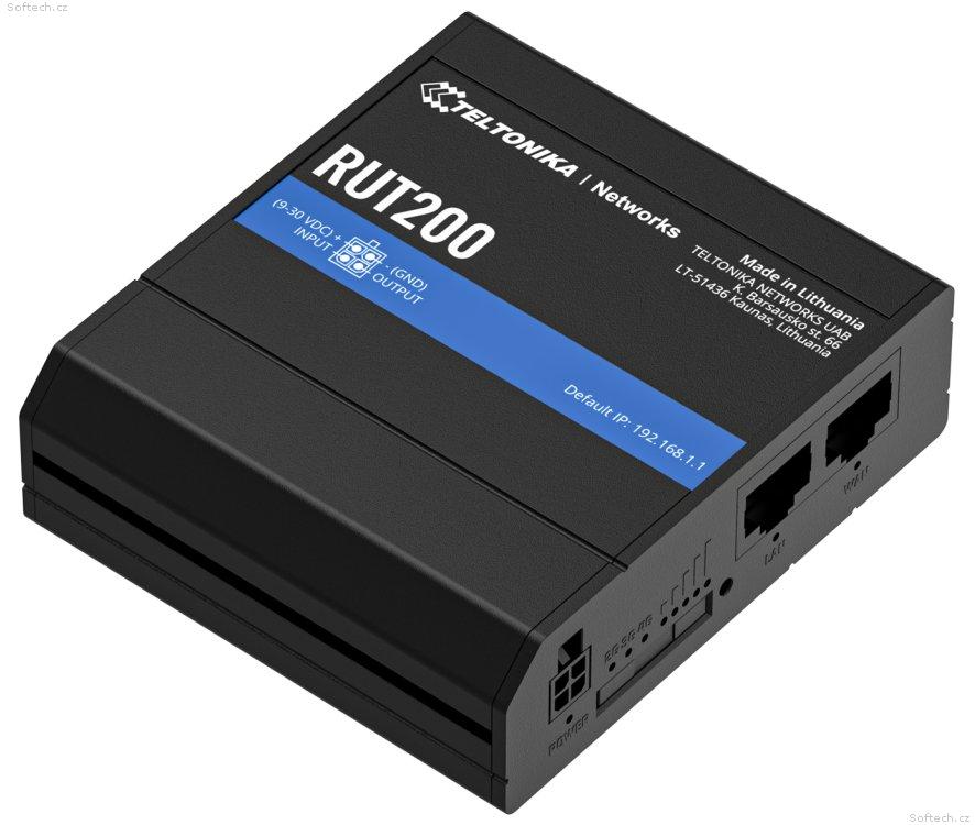 RUT200, napájecí adaptér (9 W), 2× mobilní SMA anténa, 1× Wi-Fi anténa (otočná, RP-SMA samec), příručka.