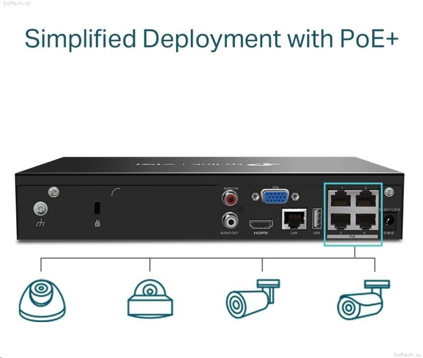 Na záznamovém zařízení najdete čtyři 10/100 Mb/s PoE+ porty. Každý z nich má výkon 30 W. Celkový PoE výkon switche dosahuje 53 W. Pomocí jediného ethernetového kabelu přenáší data i napájení. Nepotřebujete tedy žádný další napájecí adaptér.
