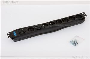 19" rozvodný panel 1U s osmi zásuvkami podle ČSN, max. 16 A. Kabel je 2 m dlouhý s univerzální CZ-DE zástrčkou.