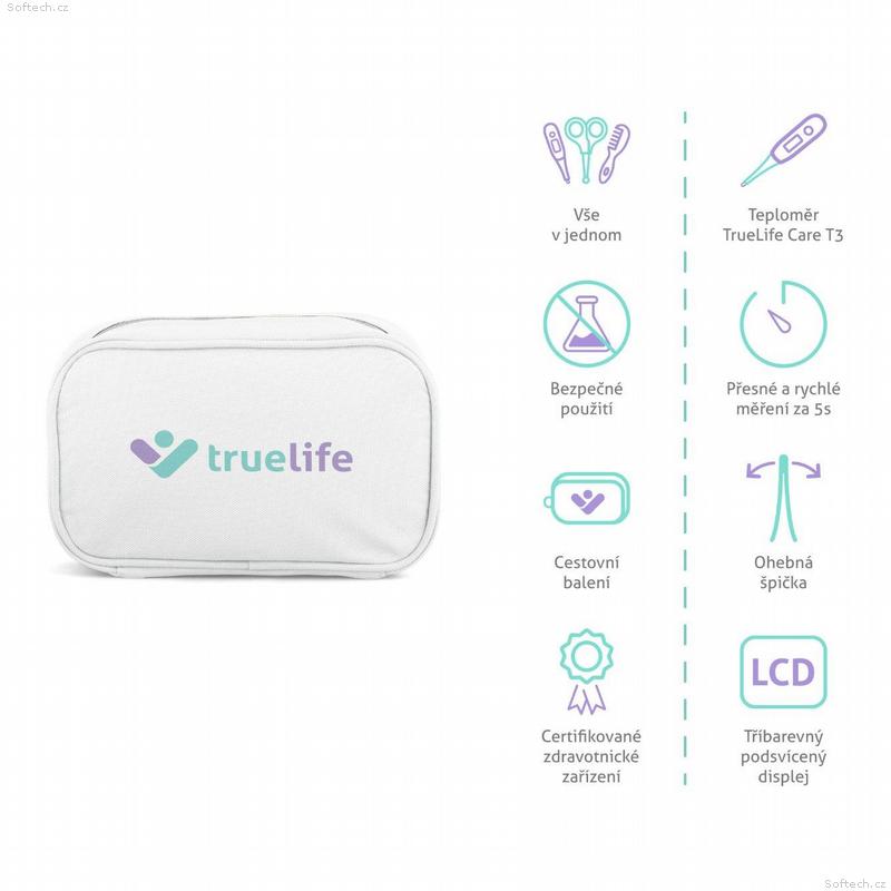 --> TrueLife BabyKit – vše, co potřebujete k péči o miminko Každý rodič dobře ví, že když přijde do rodiny miminko, je potřeba zařídit a pořídit spoustu věcí pro jeho maximální pohodlí. Některé z nich již ale nemusíte shánět jednotlivě. Nový praktický set TrueLife BabyKit obsahuje vše pro péči o nehty a vlásky a nechybí ani teploměr TrueLife Care T3 či odsávačka hlenů. Veškeré produkty jsou vyrobeny z nezávadných materiálů s maximálním důrazem na bezpečnost. Tento skvělý set se stane vaším spolehlivým partnerem nejen doma, ale i na cestách. Jeho využití přetrvá po celou dobu dětství vašeho miminka. Sada představuje také perfektní dárek pro nastávající maminky. --> Vše pohromadě Sada TrueLife BabyKit obsahuje kompletní příslušenství pro péči o nehty a vlásky děťátka a zároveň také jeho zdraví. I malým prstíkům je potřeba provádět manikúru, proto v setu naleznete nůžky a kleštičky na nehty, chybět nesmí ani pilník. Dále tu je hřeben a kartáč s jemnými štětinami na neposlušné vlásky nebo zubní kartáček, jenž lze navléknout na prst a šetrně tak vyčistit zoubky dítěte. Nezřídka využijete také odsávačku hlenů. Přesný a rychlý teploměr Zdraví dítěte ohlídá digitální teploměr TrueLife Care T3, který změří teplotu naprosto přesně již za 5 vteřin na některém z těchto tří míst: podpaží, ústa či konečník. Měřit jím lze i teplotu vodní lázně, stačí zvolit příslušný mód. Naměřené hodnoty ihned vidíte na podsvíceném displeji, který mění barvu v závislosti na naměřené teplotě. Zelená znamená normální teplotu, oranžová zvýšenou a červená signalizuje horečku. Teploměr neobsahuje rtuť ani žádné škodlivé látky a jeho ohebná špička je šetrná k pokožce miminek. Využití bezpečné i praktické Veškeré produkty v sadě TrueLife BabyKit jsou vyrobeny ze zcela nezávadných omyvatelných materiálů, aby byla zajištěna maximální ochrana dítěte. Údržba jednotlivých komponentů je navíc velmi snadná, což napomáhá k vždy perfektní hygieně. Není třeba se obávat ani poranění o nůžky, protože mají zaoblené špičky. Set TrueLife BabyKit představuje skvělé řešení domů i na cesty. Díky praktickému pouzdru je veškeré příslušenství stále pohromadě a připravené k použití. Sada byla vytvořena pro novorozence a menší miminka, ale své uplatnění najde i v batolecím věku. Vše v jednom Sada TrueLife BabyKit je kompletním balíčkem pro péči o nehty, vlasy a zdraví dítěte. Zahrnuje například i teploměr a není tedy již nutné nic dokupovat. Bezpečné na použití Ať sadu využijete pro novorozence či starší dítě, jeho bezpečnost je zaručena. Nůžky mají zaoblené špičky, kartáč jemné štětiny a vše se vyrábí ze zcela nezávadných materiálů. Cestovní balení Sadu lze využívat nejen v domácích podmínkách, ale díky praktickému pouzdru také kdekoliv na cestách. Certifikované zdravotnické zařízení TrueLife Care T3 splňuje veškeré požadavky pro klasifikaci jako zdravotnické zařízení. Teploměr TrueLife Care T3 Součástí sady je také digitální kontaktní teploměr TrueLife Care T3, který vám pomůže ohlídat zdraví vašeho dítěte. Rychlé měření teploty za 5 vteřin Na výsledek měření nemusíte čekat dlouho, teploměr TrueLife Care T3 dokáže změřit teplotu již za 5 vteřin. Ohebná špička teploměru Flexibilní špička teploměru je šetrná k pokožce, měření tedy dobře snáší i nejmenší miminka. Tříbarevný podsvícený displej teploměru Dokonale čitelný velký displej je vybaven tříbarevným podsvícením, přičemž barva značí naměřenou teplotu. Zelená ukazuje na normální teplotu, oranžová signalizuje zvýšenou a červená je známkou horečky. Parametry - Teploměr TrueLife Care T3 Typ Digitální teploměr (prediktivní) Rychlost měření 5 - 10 vteřin Rozsah měření 32,0 °C – 43,9 °C (89,6 °F – 111,02 °F) Přesnost v rozmezí 35,5 °C – 42 °C (95,9 °F – 107,6 °F) ± 0,1 °C (± 0,2 °F) Přesnost v jiném rozmezí ± 0,2 °C (± 0,4 °F) Režimy Oral / Rectal / Underarm / Bath Displej 3-barevné podsvícení s indikací teploty Paměť Posledních 10 měření Další funkce Ohebná špička, zvukové signály, alarm při horečce, přepínání jednotek (°C / °F), automatické vypnutí, indikace vybité baterie Baterie 1 × CR2032 Výdrž baterie Cca 1000 měření (1 rok při měření 3× denně) Stupeň krytí IP27 Rozměry 14,3 cm × 2,5 cm × 1,4 cm Hmotnost 21 g (s baterií) Provozní teplota 5 °C – 40 °C Skladovací teplota -10 °C – 50 °C Obsah balení 1× Teploměr TrueLife Care T3 1× Odsávačka hlenů 1× Oblé nůžky na nehty 1× Kleštičky na nehty 1× Hřeben 1× Kartáč na vlasy s jemnými štětinami 1× Zubní kartáček na prst 3× Pilník na nehty 1× Cestovní pouzdro 1× Návod a bezpečnostní instrukce 1× Návod pro teploměr TrueLife Care T3 1× Bezpečnostní instrukce pro teploměr TrueLife Care T3