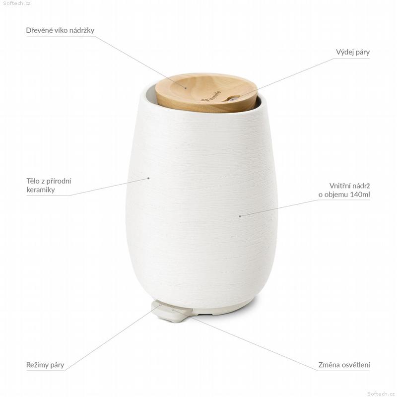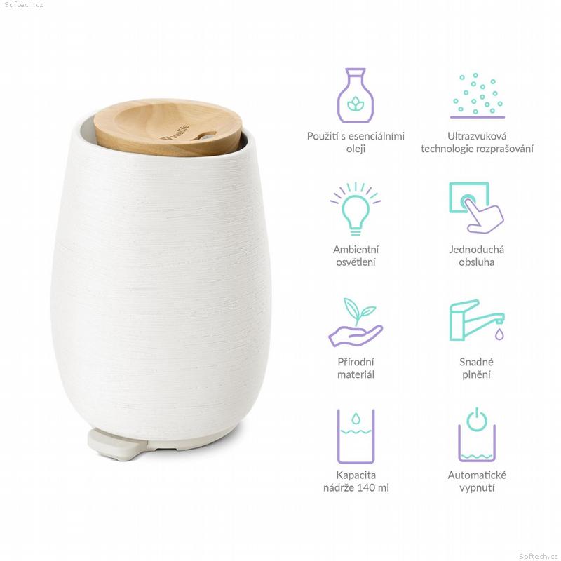 Difuzér pracuje zcela nehlučně, a to až 5 hodin. Jakmile klesne voda ve 140 ml nádržce pod určenou úroveň, přístroj se automaticky vypne. Naplnění oddělitelné nádržky je velmi snadné, podobně jako čištění či ovládání jediným tlačítkem.