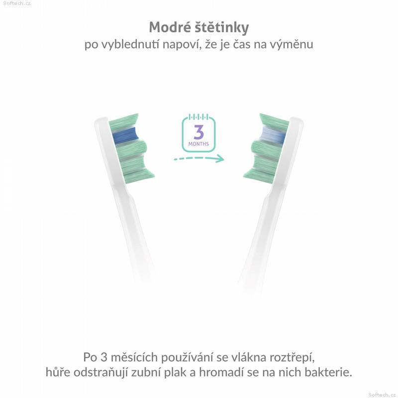 Opotřebené štětiny kartáčku se třepí, ztrácejí účinnost a hromadí se na nich bakterie. Hlavice sonického kartáčku jsou osazeny modrými štětinami, které po 3 měsících zbělají a upozorní vás tak na nutnost výměny.