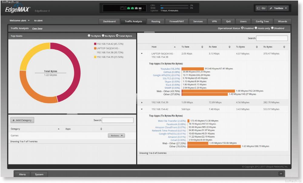 EdgeRouter 4 je vhodný všude tam, kde je nutné směrovat velké množství dat, do malých i středních firem a všude, kde je kladen důraz na bezpečnost sítě. EdgeRouter je vybaven celkem 3x Gbit ethernetovými porty, 1x SFP, dostatečně velkou operační pamětí 1GB typu DDR3, úložným prostorem o velikosti 4GB a 1x USB 3.0. Celý provoz pak řídí čtyřjádrový procesor taktovaný až na 1 GHz, MIPS64 s hardwarovou akcelerací pro zpracování paketů. EdgeRouter nabízí všechny základní funkce, které u routeru očekáváte.