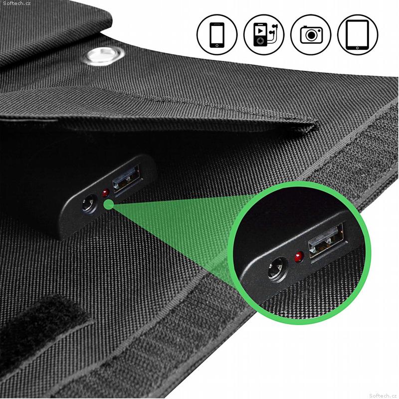 Díky USB výstupu máte dostatek energie pro veškerá zařízení do 5V/2,4A max. Pomocí DC výstupu můžete nabíjet elektroniku do 19V/1,5A. Solární panel můžete využívat při všech outdoorových aktivitách. Stačí použít vhodnou redukci z USB pro vaše zařízení.