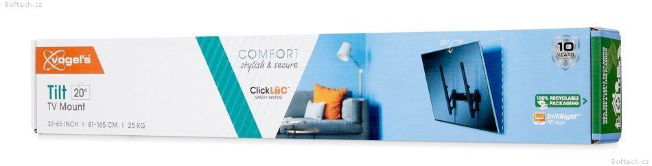 Z televizoru, který je stylově a bezpečně připevněn na stěně, budete mít větší požitek. A přesně to získáte s tímto nástěnným držákem řady COMFORT Tilt. Bezstarostné sledování pro celou rodinu. Díky jedinečnému bezpečnostnímu systému ClickLoc™ můžete televizor k nástěnnému držáku snadno uzamknout. Slyšitelné cvaknutí vám potvrdí, že je televizor bezpečně zajištěn na svém místě. Na nástěnném držáku jsou také měkké podložky. Ty zabraňují poškrábání zadní strany televizoru při jeho montáži.