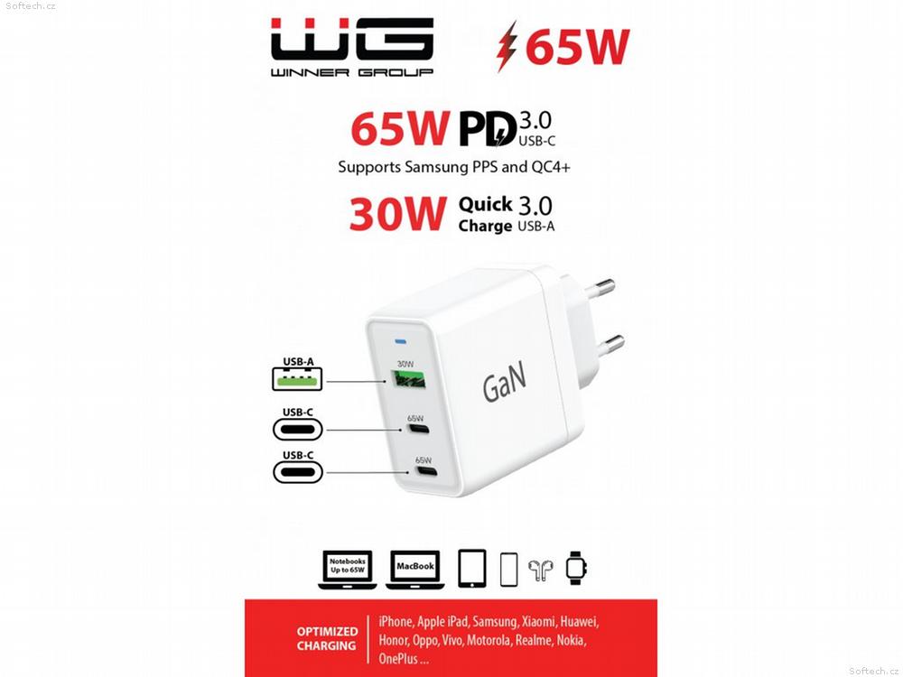 Podporuje Power Delivery 3.0 s výkonem 65W pro ultrarychlé nabíjení kompatibilních zařízení, včetně nejnovějších modelů iPhonů, iPadů, Samsung Galaxy a dalších. Dynamická technologie PPS (Programmable Power Supply) optimalizuje napětí a proud podle potřeb vašeho zařízení. Dále technologie rychlého nabíjení QC4+ je vyvinutá společností Qualcomm, která zajišťuje rychlé, efektivní a bezpečné nabíjení kompatibilních zařízení. Umožňuje současné nabíjení dvou zařízení bez ztráty výkonu.