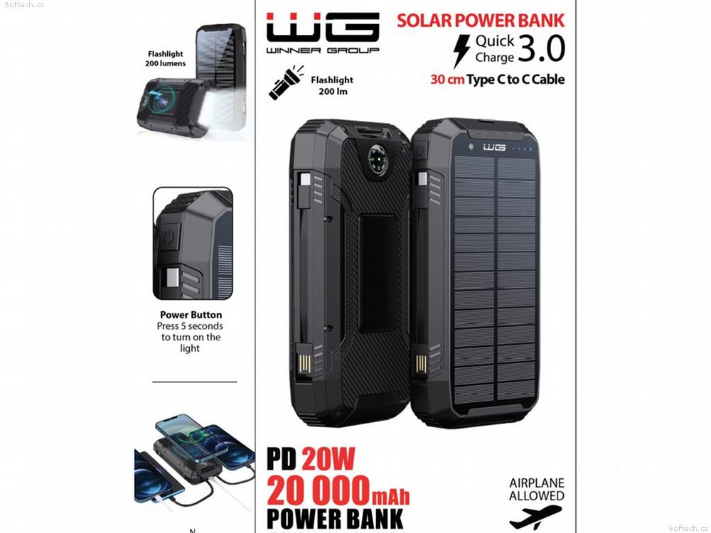 WG - Power Bank 20000 mAh, solarní panel + bezdrátové nabíjení 15W + svítilna + kompas, USB-C PD 20W, černá