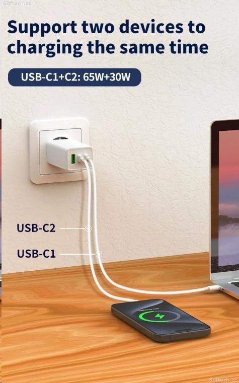Díky kombinaci 2x USB-C a 1x USB-A můžete nabíjet dvě zařízení současně, a to s optimálním výkonem.