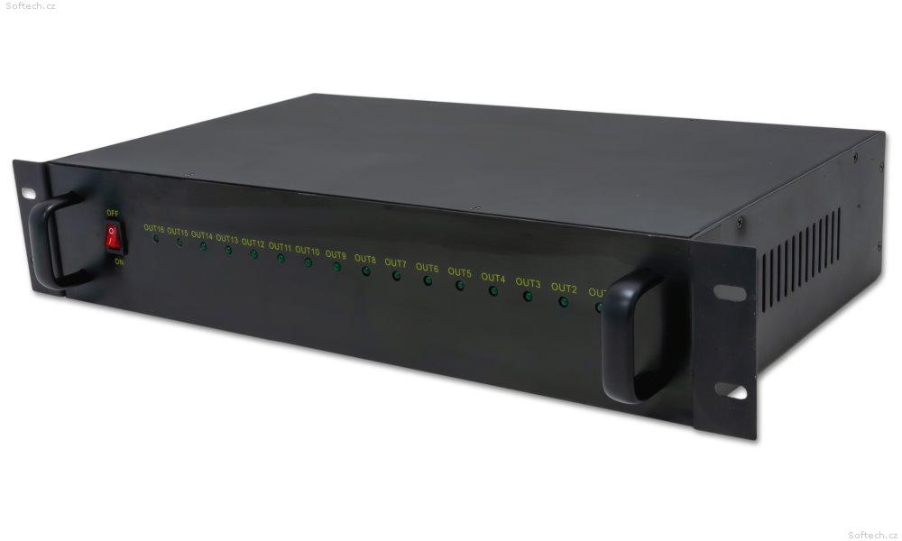 Napájecí zdroj pro instalaci do 19" rozvaděče, 24 V AC, 5 A max., 16× výstup, každý chráněn tavnou pojistkou. Bez pohyblivých částí. Volitelné výstupní napětí 24 V nebo 28 V pro každý port zvlášť na zadním panelu. LED indikátory pro vstupní a výstupní napětí