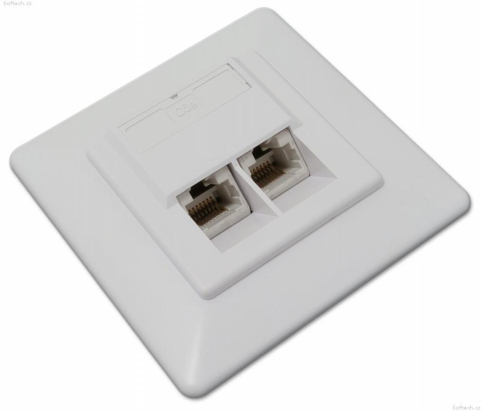 Datová zásuvka 2× RJ-45, nestíněná, pod omítku. Kategorie Cat6, konektory RJ-45 orientovány šikmo v úhlu 45°, montáž do krabice pod omítku, narážecí kabelové konektory (duální – 110 i LSA). Instaluje se do běžných elektroinstalačních krabic. Možnost krabičky pro povrchovou instalaci.