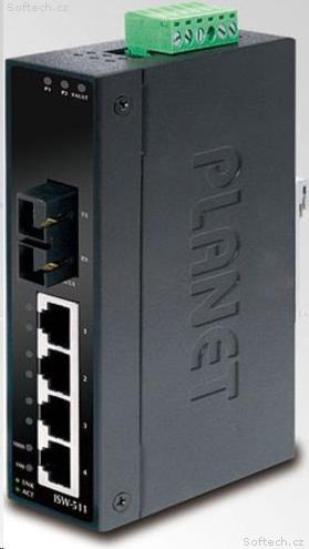 5portový přepínač a konvertor pro průmyslové aplikace. 4 porty 10/100Base-TX, 1 optický port 100Base-FX, SC konektory, multimode, 1310nm, dosah 2km.