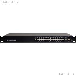 Gigabitový L3 PoE switch Ubiquiti EdgeSwitch ES-24-250W v 19" rackmount provedení s maximálním výkonem PoE napájení 250W. Managovatelný switch s 24 gigabit metalickými porty + 2 gigabitové SFP porty a celkovou propustností 26Gbps.